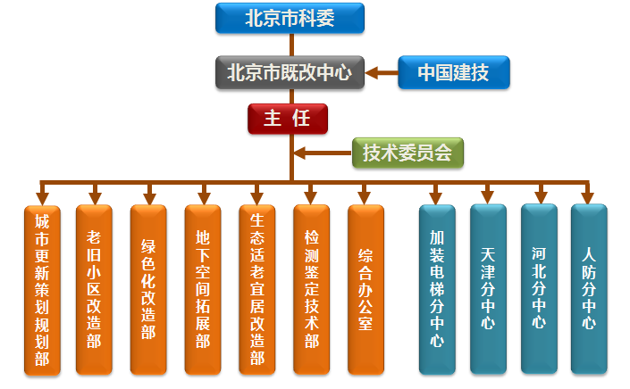 中心下設城市更新策劃規劃部、老舊小區改造部、綠色化改造部、地下空間拓展部、生態適老宜居改造部、檢測鑒定技術部和綜合辦公室。為加強協調創新,中心整合京津冀行業優勢資源,與北京筑福研究院、天津大學、中土大地公司、北京廣源興業科技發展有限公司聯合成立了加裝電梯分中心、天津分中心、河北分中心、人防分中心。