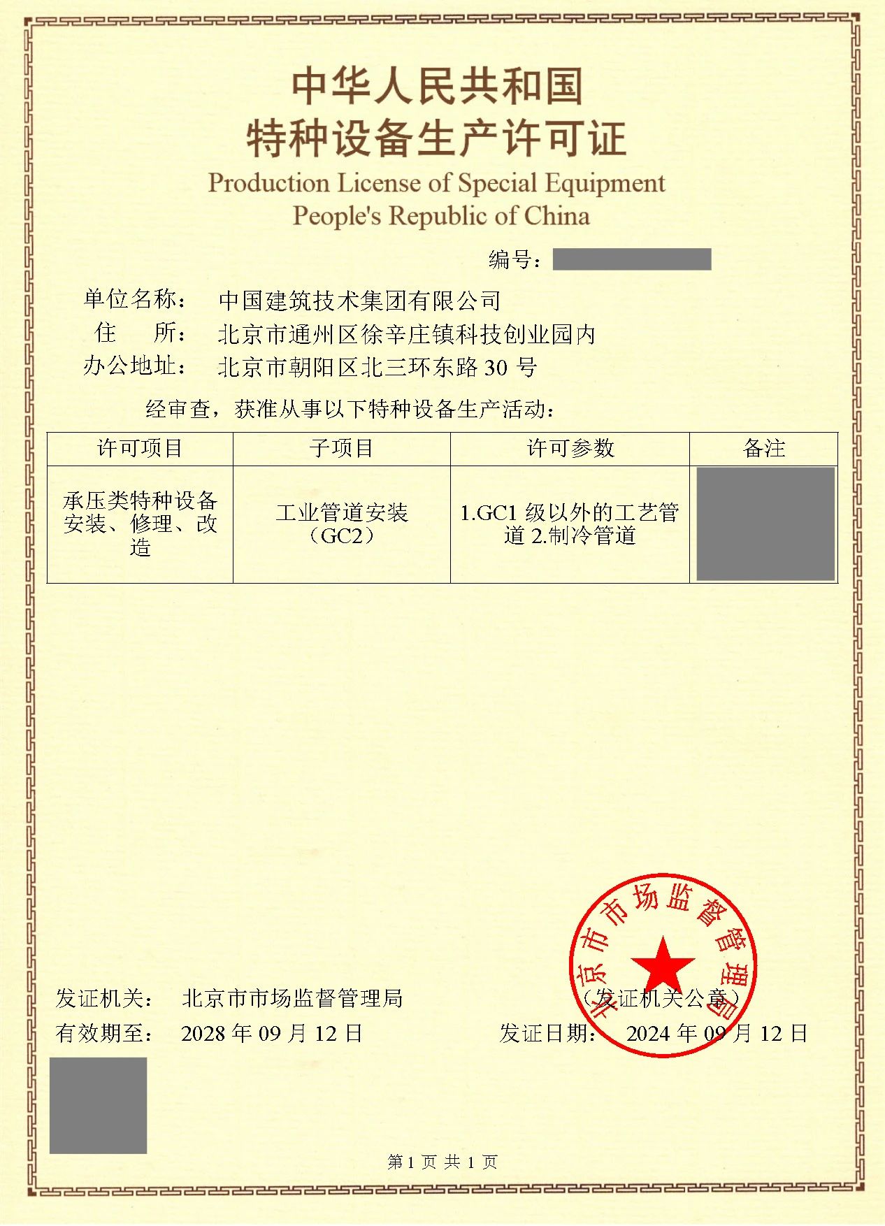 9月12日,經北京市市場監督管理局審核通過,中國建技成功取得“特種設備(GC2級工業管道安裝)生產許可證”。工業管道安裝(GC2級)生產許可證主要適用于承壓類特種設備的安裝、修理和改造。