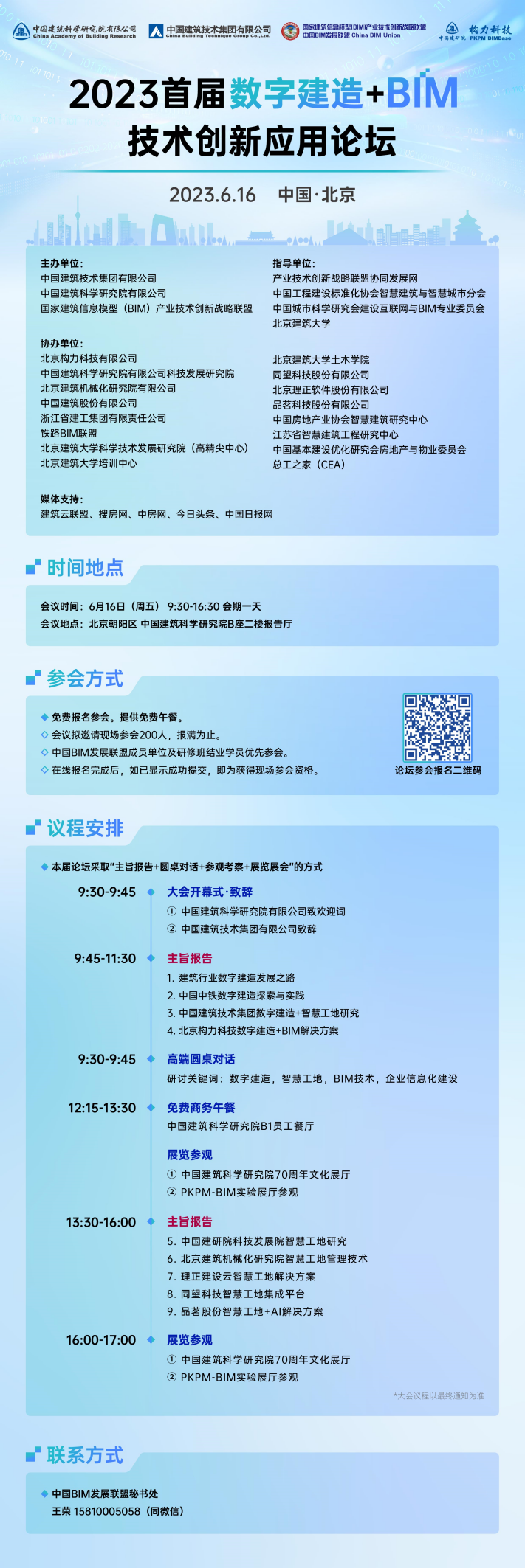 本屆論壇為中國建研院70周年院慶系列學術活動之一,論壇以“數字建造+BIM技術”為主題,邀請眾多著名專家和學者參會,期待本論壇有助于工程項目及企業數字化轉型、提升建筑業數字化建造、智慧工地數字化管理水平,促進建筑業信息化理論思考的活躍與深入。誠摯歡迎行業主管部門領導、學協會負責人、相關企事業單位負責人、技術負責人、總工程師、信息化建設負責人、工程管理和技術工作者、院校師生等共同參會。