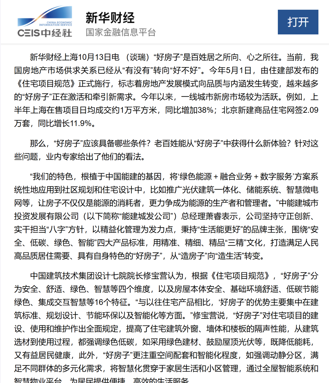 近日,“好房子”建設成為行業關注焦點——中國建技與中國能源建設股份有限公司(以下簡稱“中國能建”)在“好房子”領域的探索與實踐,獲新華財經、央廣網、國資委官網、《中國證券報》等主流媒體高頻報道。多層次、立體化的傳播矩陣不僅讓相關話題迅速破圈,單條報道最高閱讀量更突破130萬,充分彰顯兩家企業在“好房子”建設中的行業引領力,也印證了“好房子”理念與百姓宜居宜業需求的深度契合。