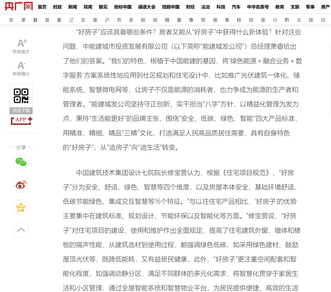 能建城發總經理蕭睿在報道中指出,企業的“好房子”實踐根植于中國能建特色,核心是將“綠色能源+融合業務+數字服務”方案系統性植入社區規劃與住宅設計: