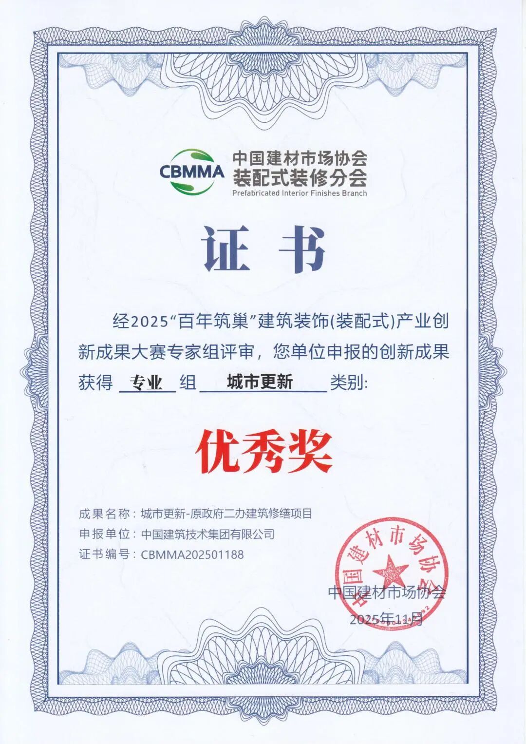 作為行業(yè)內(nèi)首個以“裝配式”為核心的高規(guī)格賽事,“百年筑巢”創(chuàng)新成果大賽代表了我國建筑裝飾裝配化發(fā)展的新方向與高水準(zhǔn),獲獎項目在技術(shù)體系、綠色性能與實(shí)施效果方面均獲得評審專家高度認(rèn)可。此次獲獎充分展現(xiàn)了中國建技在裝配式裝修與城市更新領(lǐng)域的前瞻布局與專業(yè)能力,是對中國建技技術(shù)硬實(shí)力及創(chuàng)新軟實(shí)力的雙重認(rèn)證也標(biāo)志著中國建技在裝配式裝修與城市更新領(lǐng)域的領(lǐng)先地位。
