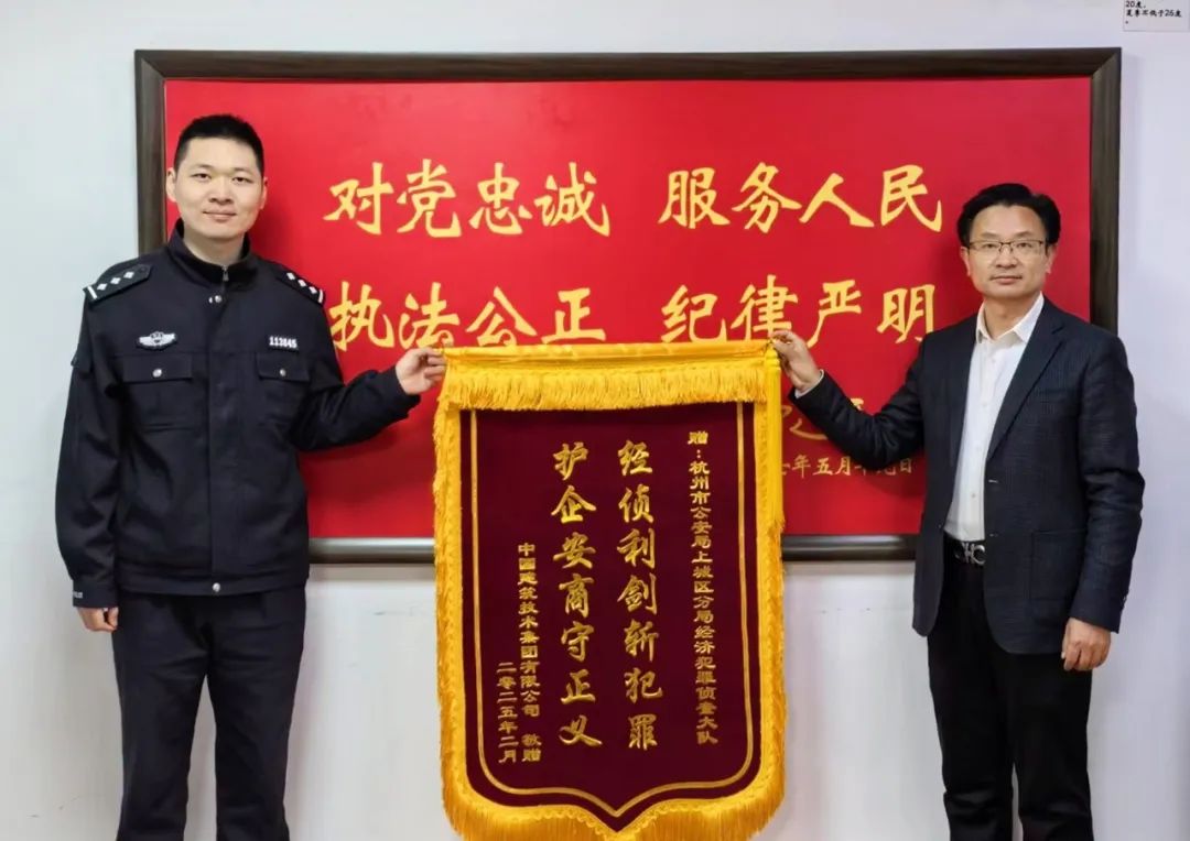 2月27日,中國建技黨委副書記、總經(jīng)理余湘北,黨委副書記、紀(jì)委書記李小陽,法務(wù)楊建旭一行專程赴杭州市上城區(qū)經(jīng)濟犯罪偵查大隊,向辦案民警代表送錦旗,對經(jīng)偵大隊在偵辦中國建技原浙江分公司總經(jīng)理系列重大犯罪案件中展現(xiàn)的專業(yè)能力表示由衷欽佩,對其高效行動致以誠摯謝意。
