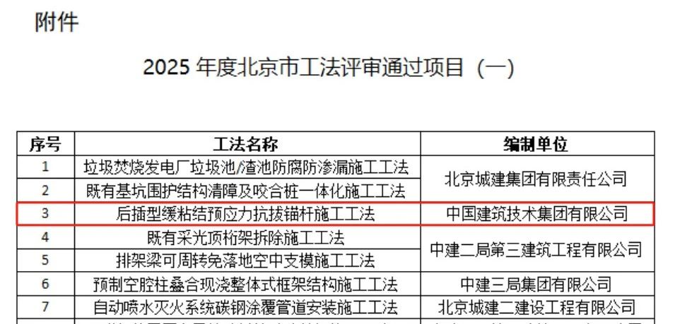 近日,由中國建技申報(bào)的“后插型緩粘結(jié)預(yù)應(yīng)力抗拔錨桿施工工法”通過了北京市住房和城鄉(xiāng)建設(shè)委員會(huì)組織的北京市工法專家評(píng)審,這一成果標(biāo)志著中國建技在技術(shù)創(chuàng)新、施工質(zhì)量和項(xiàng)目管理等方面實(shí)現(xiàn)了新的突破。