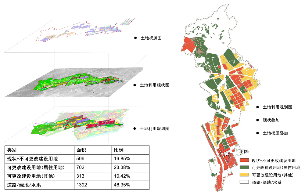 2.?土地情況梳理——對土地利用現狀情況、權屬情況、規劃情況進行三者疊加,結合產業發展方向及文化景點策劃,梳理水系及考慮產城配套,局部調整用地性質。