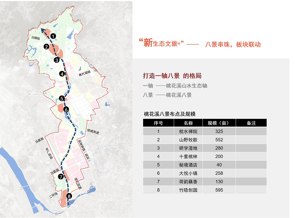 文化景觀打造——結合開福區福文化,重構桃花溪的生態系統,沿溪以綠道的方式組織內部流線,打造桃花溪八景,以景點串聯功能區,銜接周邊場地互相帶動,構建新型城市都市休閑新空間。