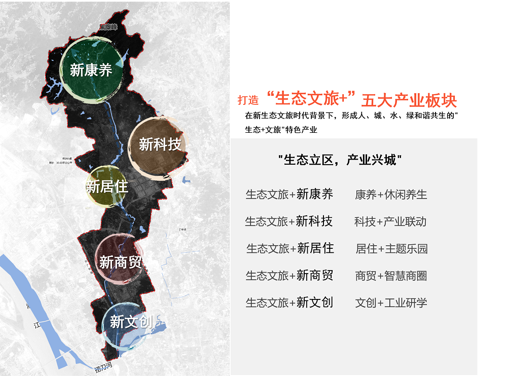 3.?產業布局策劃——在新生態文旅時代背景下,形成人、城、水、綠和諧共生的"生態+文旅"特色產業,打造“生態文旅+” 五大產業板塊,即生態文旅+新康養、生態文旅+新科技、生態文旅+新居住、生態文旅+新商貿、生態文旅+新文創。