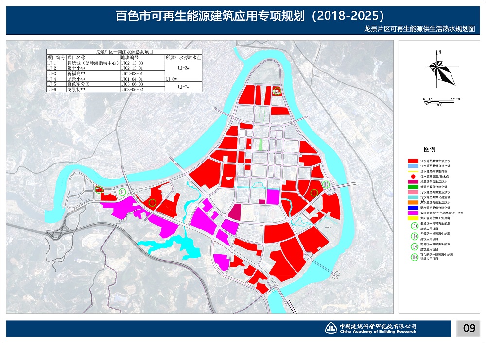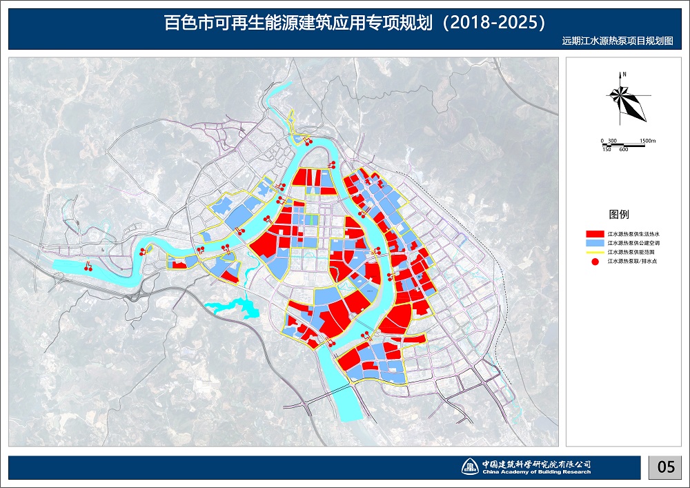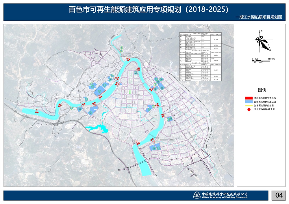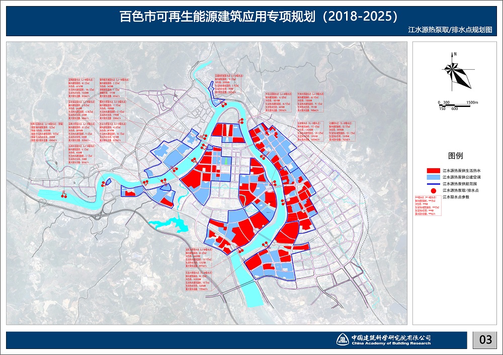 本規劃大規模應用江水源熱泵。劃針對百色市獨特的豐富水源——右江水系,專門制作江水源熱泵規劃專篇,研究江水源熱泵效率的各影響因子,以取排水點互不干擾為原則,科學排布取排水點。并根據建筑物布置確定江水源熱泵站點位置。