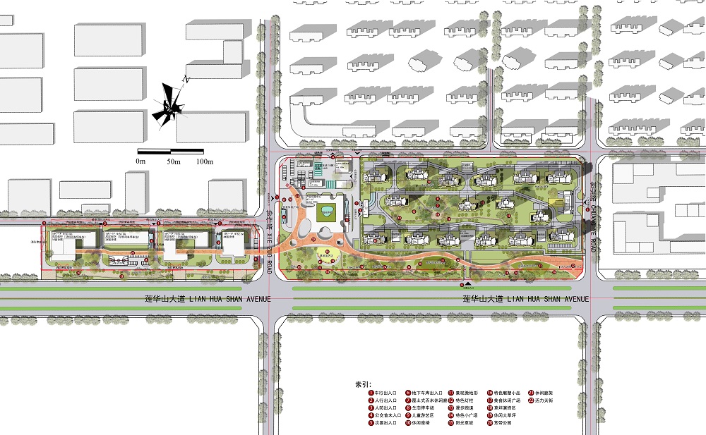通過調研分析,提出【都市綠洲、活力天街、靈動空間】三個設計理念,著力打造五大特色場景: