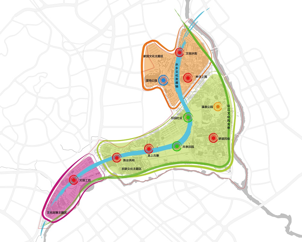 依托豐順本土如紙花、豐順石、紅陶等文化遺產,打造020水鄉特色線下品牌體驗店,形成文創工藝店、藝術博物館、水上集市、水岸公園等核心文創業態;同時,以溫泉品質住宿、特色餐飲為支撐,創造活力的、色彩斑斕的親水開放空間。