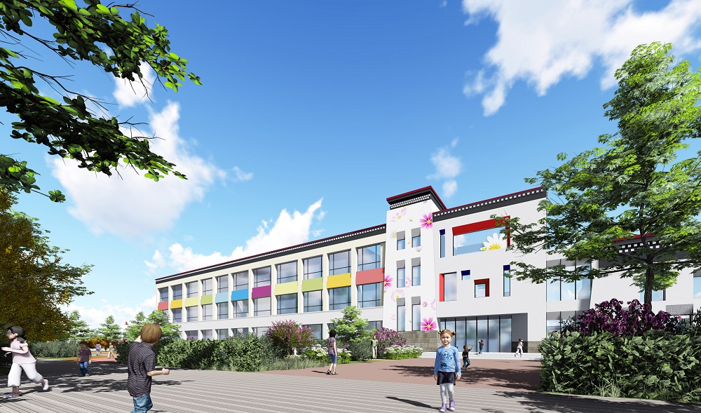 幼兒園建設響應國家相關政策,為幼兒提供獨具特色空間的環境,堅持美觀的同時,又能滿足使用功能的合理性。整體設計以現代簡潔的處理手法,在充分考慮經濟及美觀性的前提下,體現藏區建筑特色。立面采用虛實結合的處理手法,以橫向線條體聯系建筑各個部分,強調活動單元體量,創造富有秩序的立面節奏,通過明確的進退關系區分各功能區塊的轉換,塑造強烈的光影變化,為孩子提供自由靈活的生活活動場所。