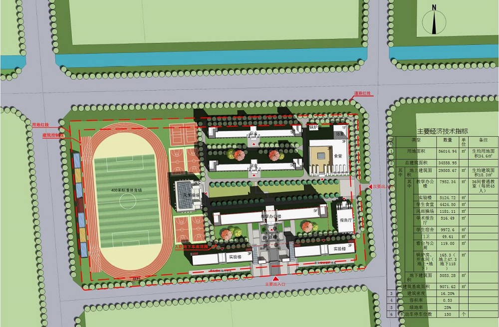 本項目位于日喀則經濟開發區內,辦學規模為36班的初級中學,包括教學樓、實驗樓、食堂、風雨操場、宿舍樓等建筑。規劃建設用地為56014.94㎡,總建筑面積34558.95㎡,其中地上建筑面積29505.67㎡,地下建筑面積5053.28㎡。本項目南、北、東、西側均為規劃道路,南側地塊為規劃薩嘎中學和崗巴中學。