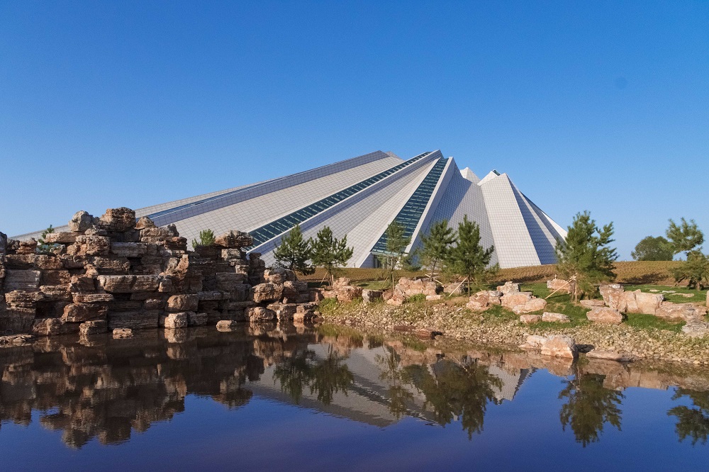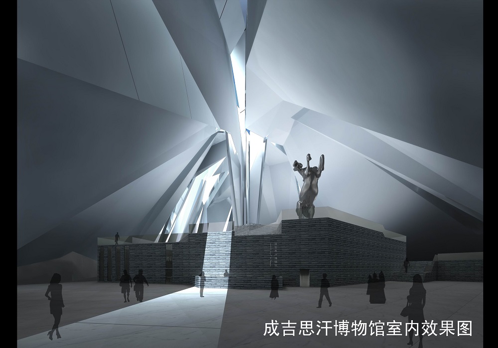 整體建筑的文化意義在于以平面形態(tài)和布局,體現(xiàn)成吉思汗開創(chuàng)的歐亞大陸版圖,并以鄂爾多斯為中心,向十三個方向發(fā)散的十三條建筑軸線代表十三世紀以及成吉思汗創(chuàng)建的十三個世界之最,象征著成吉思汗對于整個時代帶來的震撼。