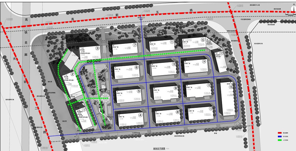 根據(jù)對(duì)場(chǎng)地周邊環(huán)境及場(chǎng)地本身的特點(diǎn),結(jié)合高新區(qū)規(guī)劃局的規(guī)劃設(shè)計(jì)要求,本方案分別在光谷二路及高新五路布置主要出入口,結(jié)合中心花園設(shè)計(jì),通過(guò)南北、東西方向兩條主要視覺(jué)景觀軸線塑造園區(qū)良好的景觀形象。從而打造高檔建筑標(biāo)準(zhǔn),優(yōu)異的環(huán)境品質(zhì)新型高端研發(fā)生產(chǎn)園區(qū)。建筑空間布局北高南低,在高新五路與光谷二路交叉口處設(shè)置兩棟標(biāo)志性25層孵化器研發(fā)大樓。沿高新五路設(shè)置9層研發(fā)車間,基地內(nèi)部建筑層數(shù)高低錯(cuò)落,整個(gè)建筑群天際線變化豐富。