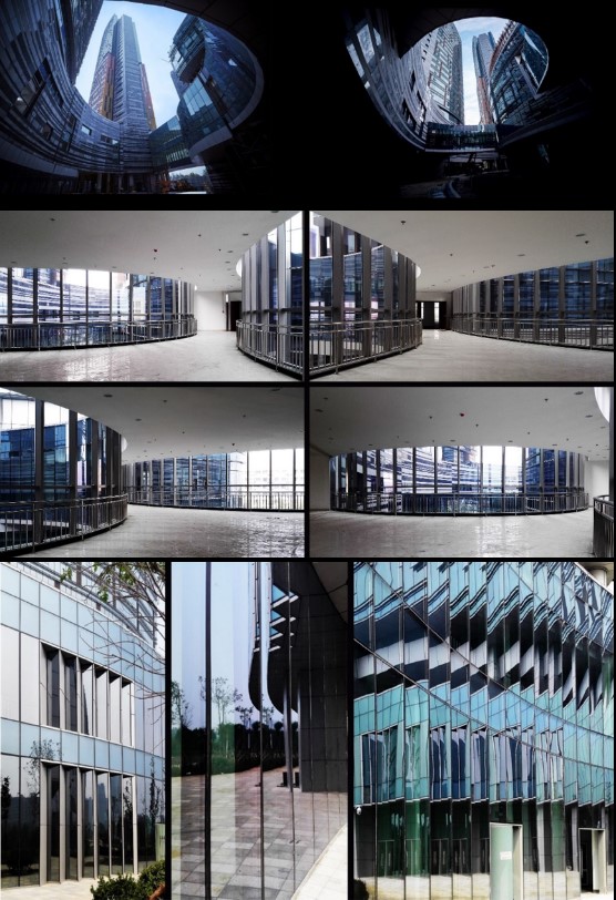 建筑空間設(shè)計以“自由流動”構(gòu)筑了步行街、庭院及室內(nèi)空間體驗的基本特征,連續(xù)塑造了引導(dǎo)漫步徐行、激發(fā)交流互動的事件場所,不斷暗示著“伴水而生”的獨(dú)特環(huán)境感知。而建筑立面設(shè)計以玻璃這一常規(guī)材料的非常規(guī)組合應(yīng)用,探討了“環(huán)境影像”積極介入并與實體環(huán)境互動對話的可能性。反射所形成的“虛線化的環(huán)境影像”被重新植入到連續(xù)的物質(zhì)環(huán)境之中,以其超現(xiàn)實的陌生感激發(fā)了人們對習(xí)以為常、視而不見的自然環(huán)境的重新關(guān)注與感知。
